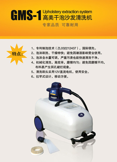 (3)操作步凑:使用GMS-1高美干泡沙发清洗机(采用ZL032212437专利发泡技术),先泡沫制造、再使用电动刷洗二合一仔细刷洗,然后通过吸水设备吸附掉清洗后的全部干泡剂。